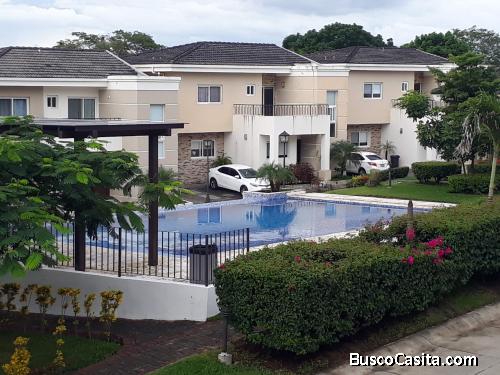 Casa en condominio de 2 plantas, con sala,comedor, cocina, cuarto de servicio con baño completo, área de lavandería, terraza, patio amplio, cuarto de estudio. 3 habitaciones con AC, abanico de techo y baños completos , 3.5 baños ,balcón y sala familiar de tv.